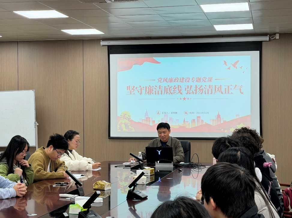 为切实增强本科生党员纪律规矩观念,2025年12月10日中午,物理与电子信息工程学院董明刚院长在07424为学院本科生第一党支部全体党员讲授了一堂深刻生动的廉政专题党课。