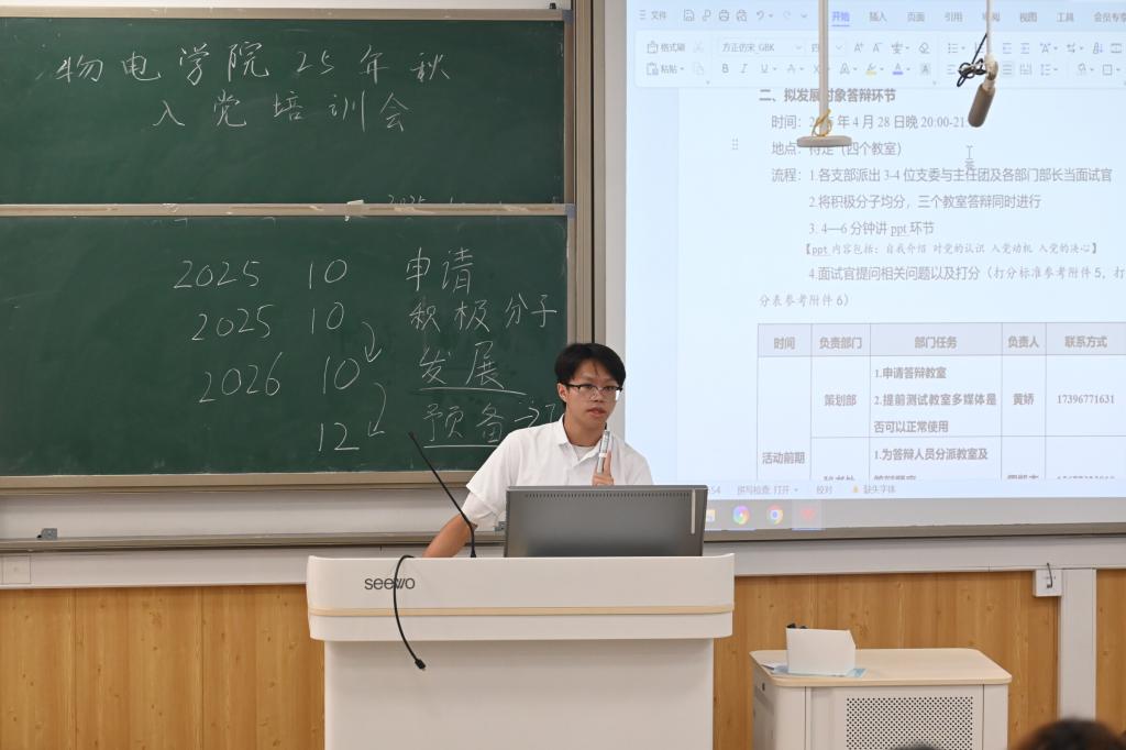 2025年10月11日中午,物理与电子信息工程学院在05306教室召开2025年入党积极分子培训会。会议由学院党务中心主任刘光崎同学主持,全体入党积极分子参加。 培训会上,通过分享学生党员在科研创新中勇攀高峰、在志愿服务里无私奉献的优秀事迹,生动展现了学生党员的先进性和示范引领作用。 随后,讲解了党员的权利和义务,告诉大家党员享有参加党的会议、阅读党的文件、接受党的教育培训等权利,同时必须履行认真学习党的理论、贯彻执行党的基本路线、发挥先锋模范作用等义务。并且指出权利和义务是辩证统一的,入党积极分子要从现在开始就以党员标准严格要求自己。 此次培训为入党积极分子搭建了学习交流的平台,进一步加深了同学们对党的认识。大家纷纷表示,将以此次培训为契机,认真学习党的理论知识,明确党员的权利和义务,熟悉发展党员流程,不断提升自身思想政治素质,在实践中锤炼党性修养,以实际行动践行入党初心,努力为党和国家的事业贡献青春力量。 现场图片(一) 现场图片(二) (一审:夏琳,二审:蒋琼,三审:秦勤忠)