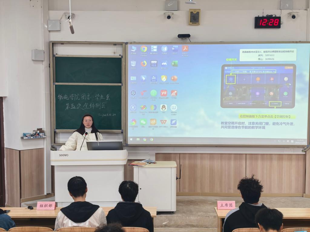 2025年11月20日中午,物理与电子信息工程学院团委、学生会在07319教室召开秋季学期第十一周全体例会。会议由田波同学主持,学院团委书记姚倩老师出席,全体成员参会。
