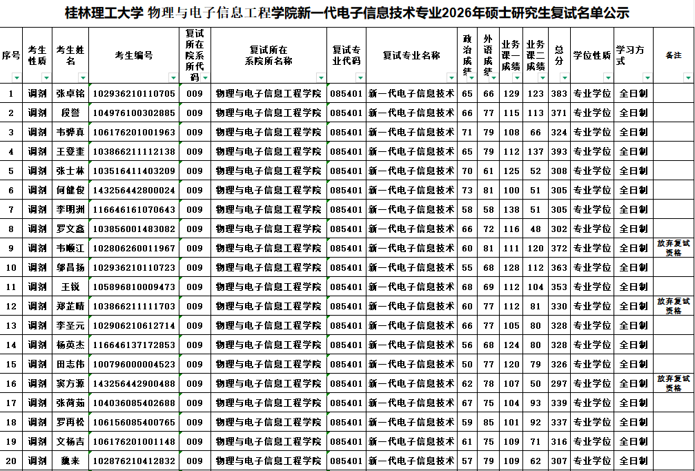 桂林理工大学 物理与电子信息工程学院新一代电子信息技术专业2026年硕士研究生复试名单公示