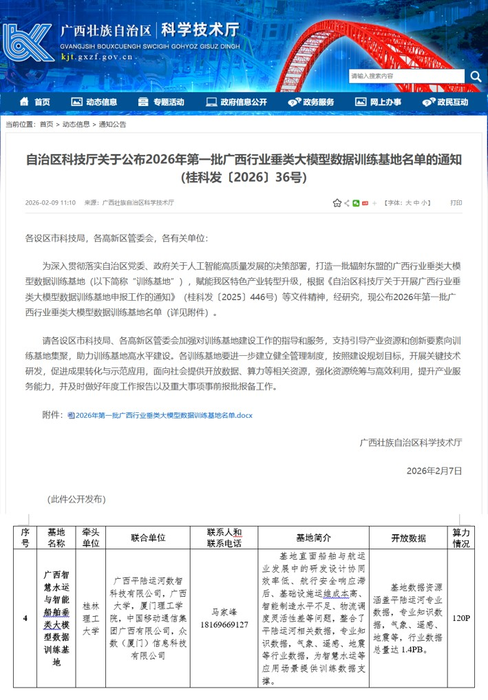 近日,自治区科技厅公布2026年第一批广西行业垂类大模型数据训练基地认定名单。由我院牵头,联合平陆运河数智科技有限公司、广西大学、厦门理工学院、中国移动通信集团广西有限公司、众数(厦门)信息科技有限公司等行业优势单位申报的“广西智慧水运与智能船舶垂类大模型数据训练基地”成功入选。这是对我院在智慧水运、智能船舶领域以及大模型数据工作的学科优势、科研实力与产业服务能力的高度认可,标志着学校在服务区域人工智能战略布局中又迈出了坚实一步。